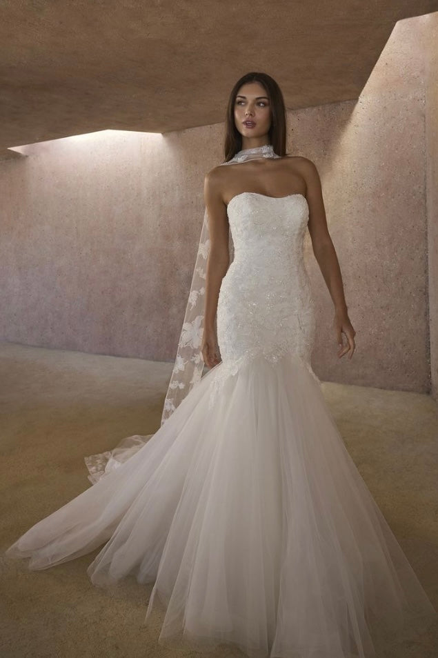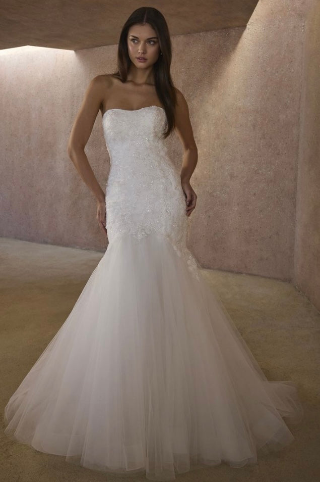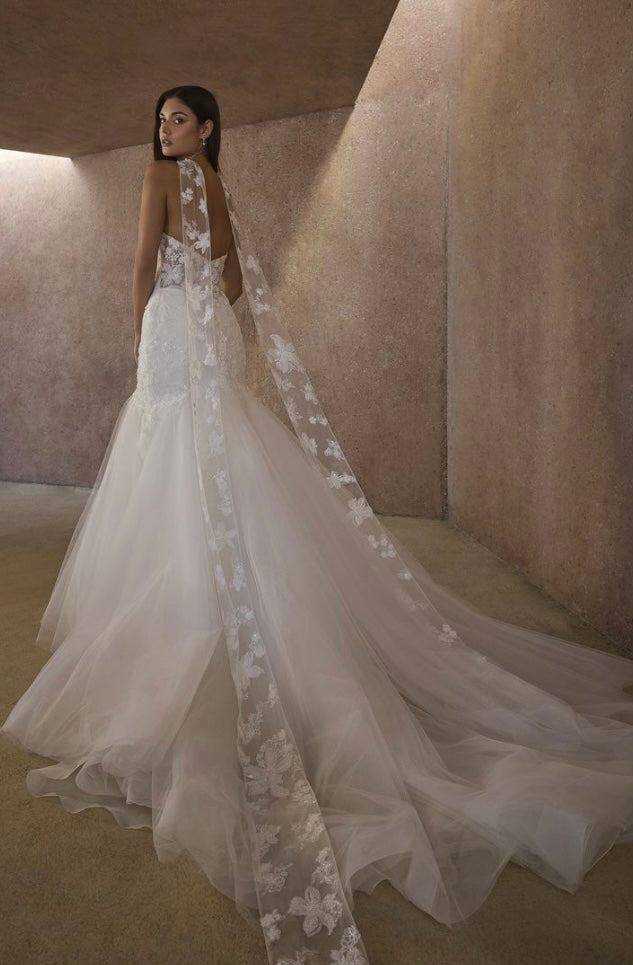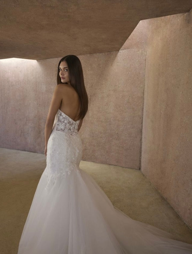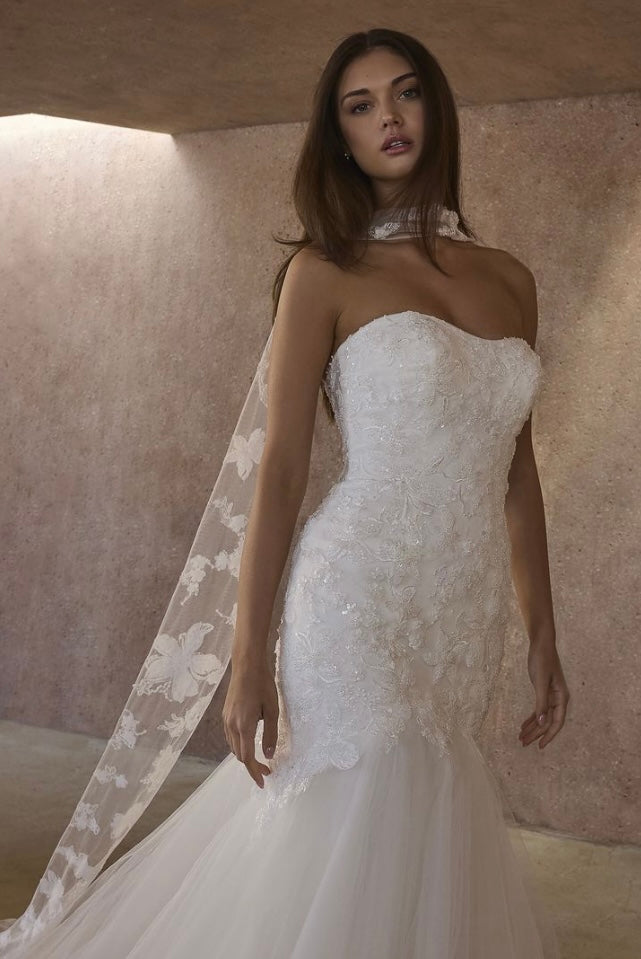 Be the Queen you truly are In this luminous setting, where architectural angles meet soft shadows, bold romance andcontemporary sophistication intertwine. The Milicent mermaid gown embodies these characteristics, beginning with her strapless bodice and modified sweetheart neckline, designed to accentuate the bride’s décolletage. From there, beaded lace appliqués and sequins shimmer across the bodice, waistline, and hips, creating a radiant, figure-sculpting effect. Milicent is cut from stretch lining, tulle, and organza, allowing the gown to hug the silhouette before cascading into a cathedral-length tulle train.