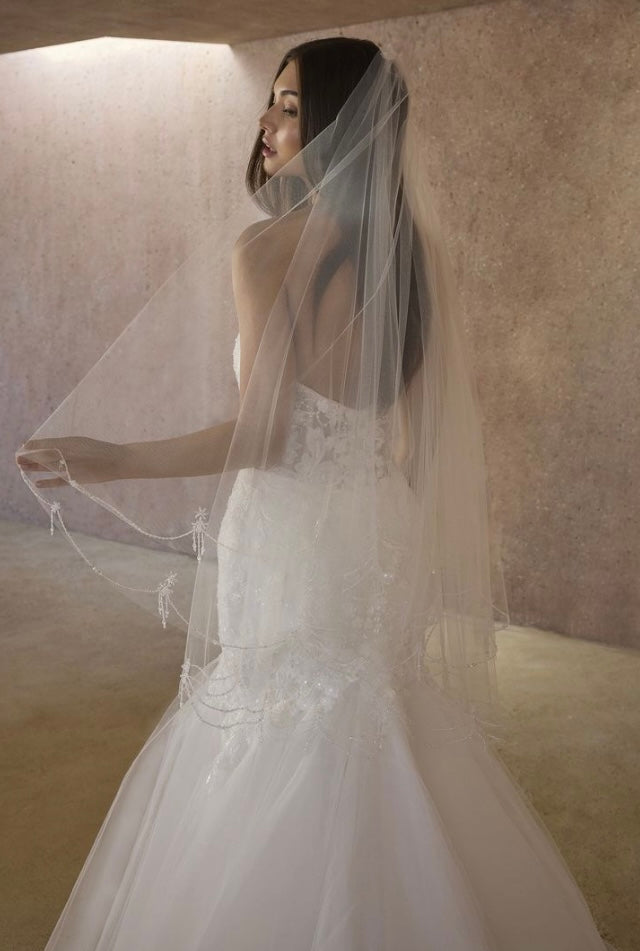 Elevate this 2-in-1 style with the optional scarf (SF001) and complete the look with her matching knee-length veil (2616V) offered separately.