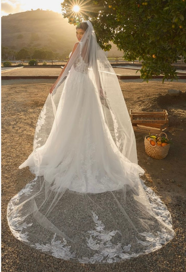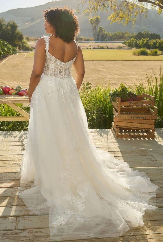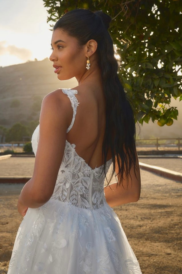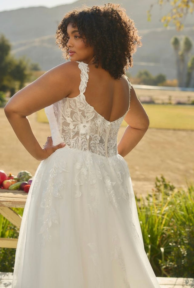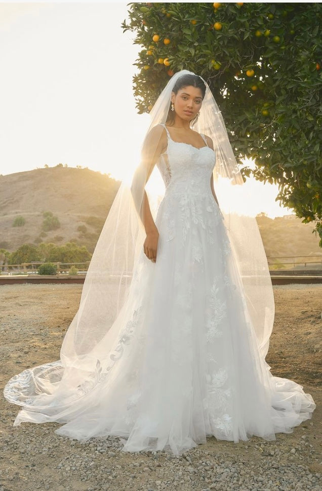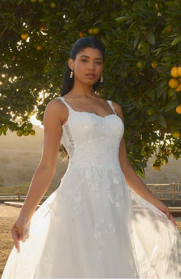 Glowing in the afternoon light, BL485-2 Hawthorn is soft, romantic, and ethereal. This A-line silhouette flows effortlessly, featuring a scalloped sweetheart neckline and delicate tank straps that frame the bodice with timeless beauty. Crafted from stretch lining and layers of airy tulle, the gown is adorned with sequin lace appliqués, adding a shimmer that catches the sunlight with every move. A zipper closure at the back ensures a seamless, structured fit, while the flowing skirt brings sweeping drama to the silhouette. Perfect for the bride seeking a gown that feels as natural and radiant as the setting around her. Pair Hawthorne with her matching cathedral veil to extend her train from 60 to 85-inches, BL485V offered separately.