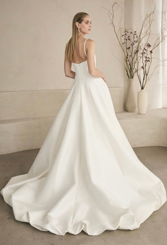 Introducing Dionne , a Sophisticated blend of romance and modernity. This gown features a plunging notched V-neckline that beautifully enhances the décolletage, paired with simple spaghetti straps to elongate the silhouette. Her bodice is crafted with 12-point boning and an inner hook-eye fit panel, providing structure and a corset-like aesthetic. Made from luxurious, stretch Mikado and a soft lining, this A-line gown ensures a comfortable, flattering look. The back of the dress features a sweeping 65-inch train with a unique balloon hem, adding a touch of contemporary playful charm.